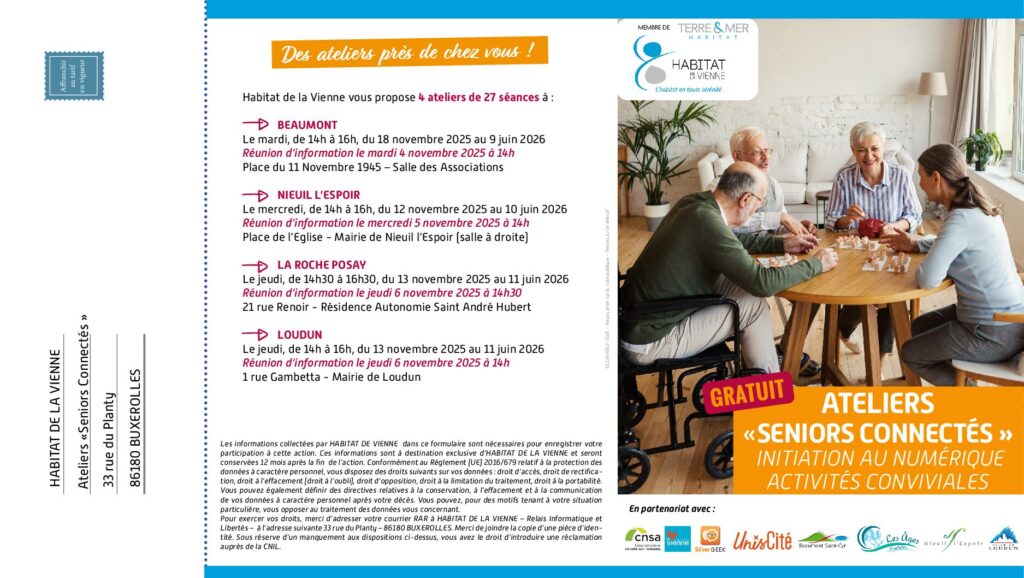 En partenariat avec les associations Silver Geek et Unis-Cité, et avec le soutien de la CFPPA86, Habitat de la Vienne vous propose une vingtaine de séances hebdomadaires animées par une équipe de jeunes volontaires en Service Civique, dans une ambiance bienveillante et adaptée à votre rythme.
