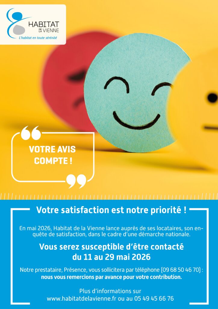 Parce que votre bien‑être au quotidien est essentiel, nous lançons prochainement notre enquête de qualité de service 2026, réalisée tous les trois ans auprès de l’ensemble de nos locataires. Cette démarche, inscrite dans un cadre national, a pour objectif de mieux comprendre vos attentes, d’évaluer la qualité de nos services et d’identifier les axes d’amélioration à mettre en œuvre pour répondre toujours mieux à vos besoins.